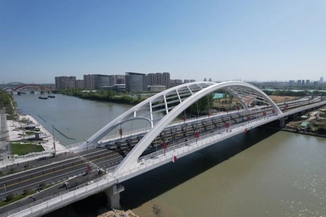 揚(yáng)州二里橋路跨京杭運(yùn)河工程是連接老城區(qū)與新城市中心商務(wù)區(qū)的重要分流通道。項(xiàng)目部以黨建聚力、科技賦能,組織青年突擊隊(duì)保障總重量超5000噸的主橋鋼結(jié)構(gòu)頂推安全。面對(duì)臨時(shí)墩單點(diǎn)集中荷載最大1138噸,突擊隊(duì)員嚴(yán)控支架穩(wěn)定,每日觀測(cè)沉降,確保頂推順利完成。同時(shí),克服梅雨及高溫影響,20余天完成鋼結(jié)構(gòu)系梁吊裝,應(yīng)用“免鑿毛止?jié){帶”“自動(dòng)化噴淋臺(tái)車”“Cooker保溫車”等工藝優(yōu)化資源,提升質(zhì)量。工程通車后,高效承擔(dān)路網(wǎng)銜接轉(zhuǎn)換功能,顯著分流老城與新城核心區(qū)交通壓力,為帶動(dòng)運(yùn)河兩岸的基礎(chǔ)建設(shè)及經(jīng)濟(jì)發(fā)展提供強(qiáng)力交通支撐。